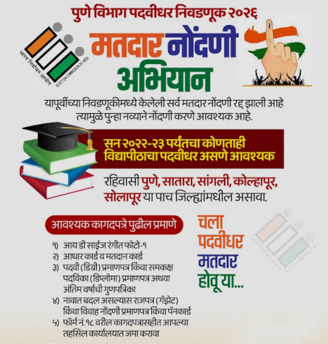 भोर – पुणे विभाग पदवीधर आणि शिक्षक मतदार संघासाठी भोर तालुक्यामध्ये मतदार नोंदणीला प्रारंभ झाला असून भोरचे उपविभागीय अधिकारी डॉ विकास खरात व तहसीलदार राजेंद्र नजन यांनी तालुक्यातील सर्व पदवीधर मतदारांना मतदार नोंदणीसाठी आवाहन केले आहे .या मतदार नोंदणीची शेवटची तारीख ६ नोव्हेंबर २०२५ असल्याने या तारखेपूर्वी दोन्ही मतदार संघांकरिता पात्र व्यक्तींनी अर्ज करावेत आणि लवकरात लवकर नोंदणी प्रक्रिया पूर्ण करावी असे सांगण्यात आले आहे.
