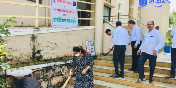 भोर : भाेर दिवाणी न्यायालय भोर व भोर वकील संघटना यांच्या संयुक्त विद्यमाने मा. ना. उच्च न्यायालय, मुंबई यांचे निर्देशानुसार व मा. जिल्हा न्यायालय, पुणे यांचे मार्गदर्शनाखाली भाेर दिवाणी न्यायालयातील आवारामध्ये स्वच्छता हीच सेवांतर्गत मोहिमेद्वारे स्वच्छता करण्यात आली .व स्वच्छते विषयी जनजागृती देखील करण्यात आली. यावेळी दिवाणी न्यायालयाचे प्रमुख न्यायाधीश श्रीमती नेहा नागरगाेजे यांनी स्वच्छते संदर्भात मार्गदर्शन केले.