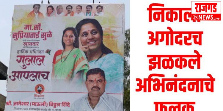 असे असताना पुणे सातारा रस्त्यावर शिंदेवाडी (ता.भोर) गावात शिवसेना उद्धव बाळासाहेब ठाकरे गटाचे भोर तालुका प्रमुख ज्ञानेश्वर उर्फ माऊली शिंदे यांनी चक्क सुप्रिया सुळे यांच्या विजयाचे, खासदार म्हणून विजयी झाल्याबद्दल अभिनंदन करते असल्याचे फलक लावले आहेत. “मा. सुप्रिया सुळे यांची बारामती लोकसभा मतदार संघाच्या खासदार पदी निवडून आल्याबद्दल हार्दिक अभिनंदन.” “गुलाल आपलाच”, “विजय निश्चित”, “कोण म्हणतोय येत नाय, आल्याशिवाय राहत नाय”, असा मजकूर लिहिलेले फलक लावले आहेत. पुणे सातारा रस्त्यावरुन प्रवास करताना हे फलक प्रवाशांचे लक्ष वेधून घेत आहेत.