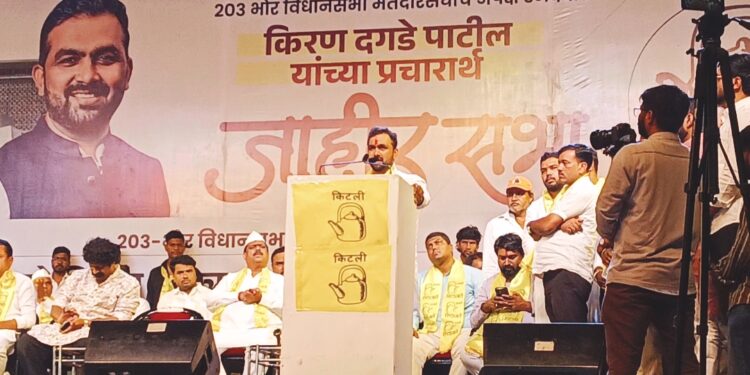 २०३ भोर वेल्हा मुळशी मतदार संघाचे अपक्ष उमेदवार किरण दगडे यांनी आपल्या प्रचाराचा शुभारंभ गुरूवारी रायरेश्वराच्या मंदिरात अभिषेक होम हवन करत केला आणि त्यांच्या प्रचाराची जाहीर सभा भोर येथील छत्रपती शिवाजी महाविद्यालयाच्या प्रांगणात गुरुवार (दि.७) पार पडली.यावेळी प्रचारार्थ प्रमुख उपस्थिती सिनेअभिनेते, दिग्दर्शक सुपरस्टार प्रविण तरडे उपस्थित होते. प्रविण तरडे यांनी सध्याचा काळ महाराष्ट्रात अपक्ष उमेदवारांचा काळ आहे .जो गोरगरिबांचा मी त्याचा, मी स्वतः मुळशीत किरणचा प्रचार करणार आहे कोणत्याही सरकारी शासकीय योजना, अनुदान,कोणाचा पैसा पाठिशी नसताना किरणने जनतेची कामे केली आहेत.जमिनी विकत घेणा-यां विरोधात जमिनी राखणारा किरण अपक्ष उमेदवार उभा आहे त्याच्या पाठीशी तुम्ही खंबीरपणे उभे रहा असे आवाहन करीत येत्या २३ तारखेला किरणच्या विजयाच्या मिरवणुकीत मी येथे असणार असे तरडे यांनी सांगितले.